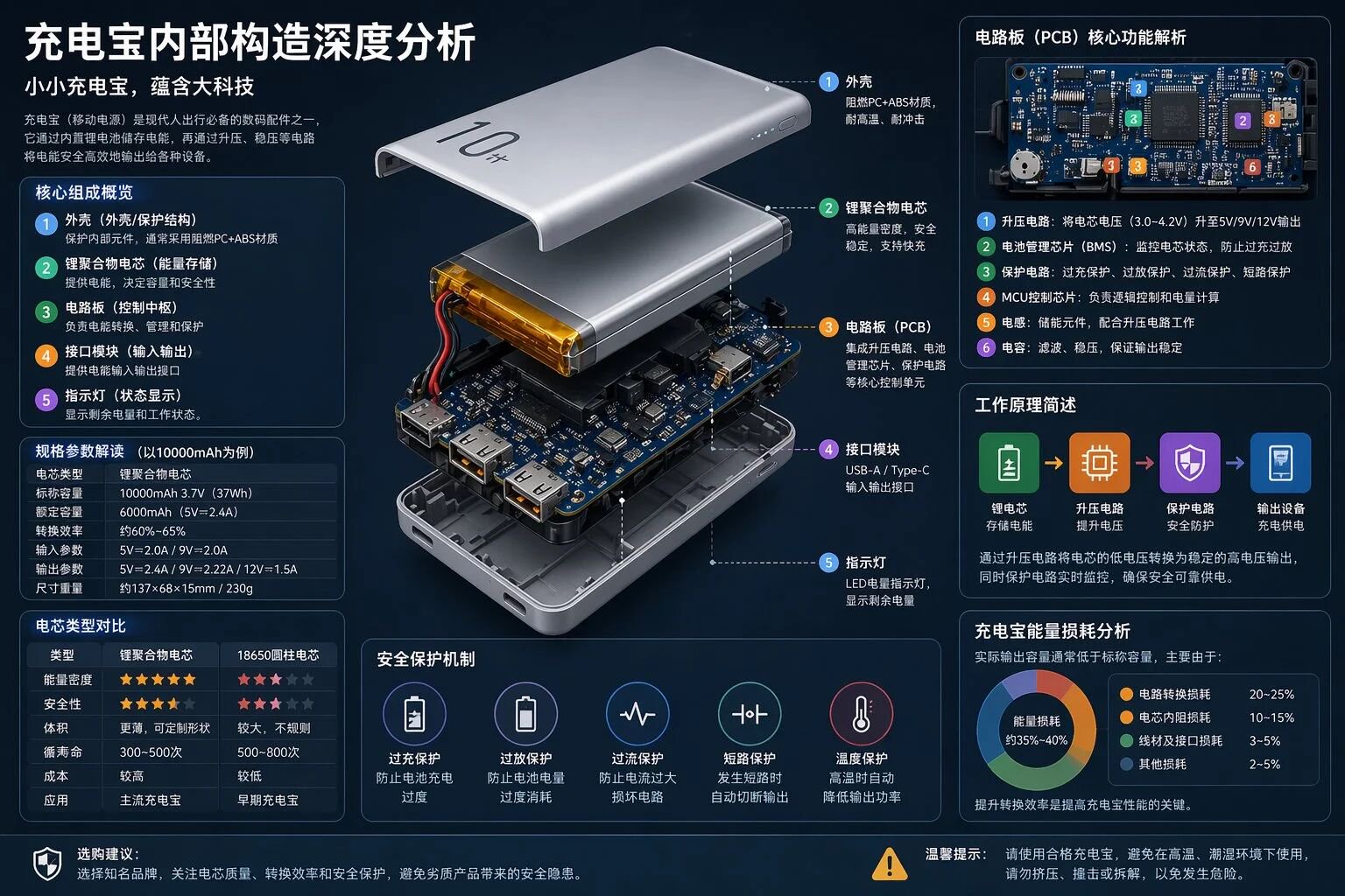 或者是给一个产品做原理分析图,这里我拆解了一个充电宝,🍞 给我生成一张充电宝内部构造的深度分析图片
