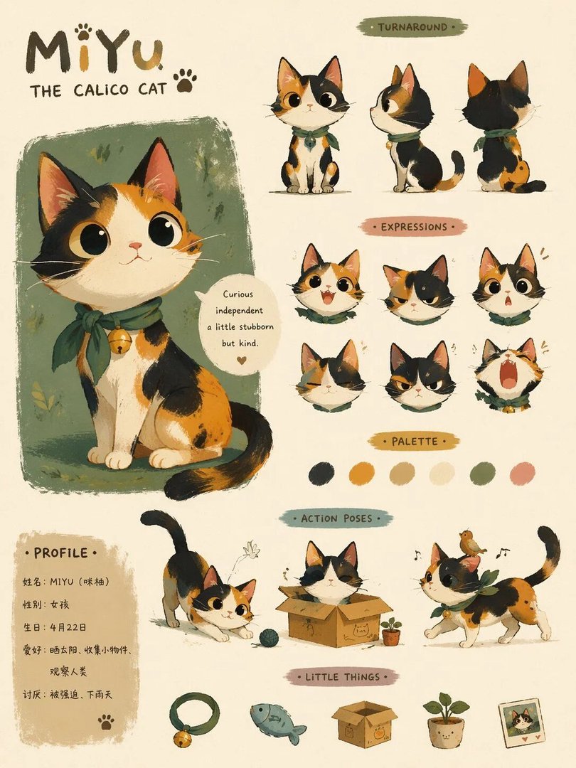 而且,这次 Image 2 的更新,其实它对于 IP 类的形象设计做得也会更好。比如说,这里我让 Lovart 直接帮我做了一个三花猫的 IP 形象的设计图。 我给的提示语就只是一句帮我给一只可爱的三花小猫设计一个 IP 形象,就得到了下面这张图。这张图的内容非常全面,既有它的三视图,又有各种表情和配色,甚至还做出了它的个人简介,包括性格、平时喜欢玩的道具以及它的习惯,整个 IP 图的设计既美观又详细。