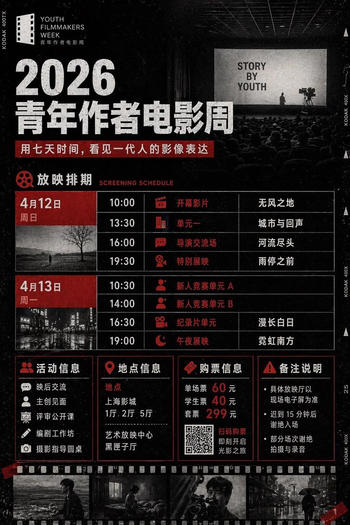 或者是这种青年作者电影周的放映排期表,对应的信息都覆盖在它应有的位置上,整个排版非常有条理和设计感。