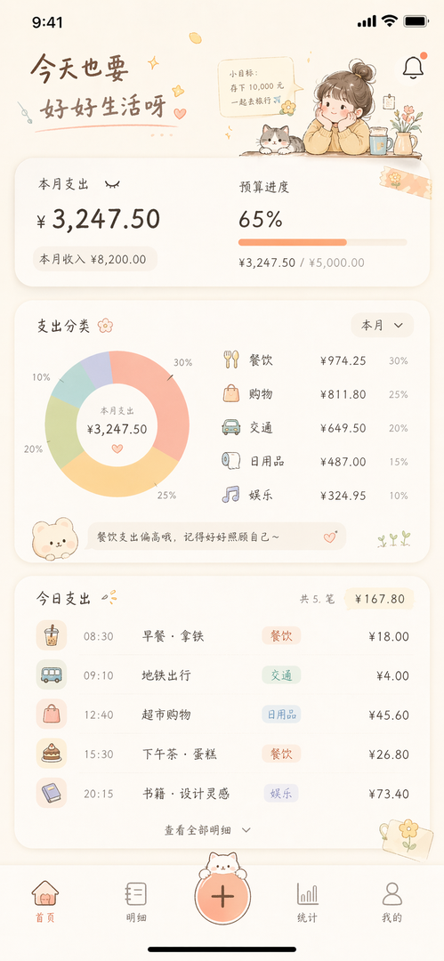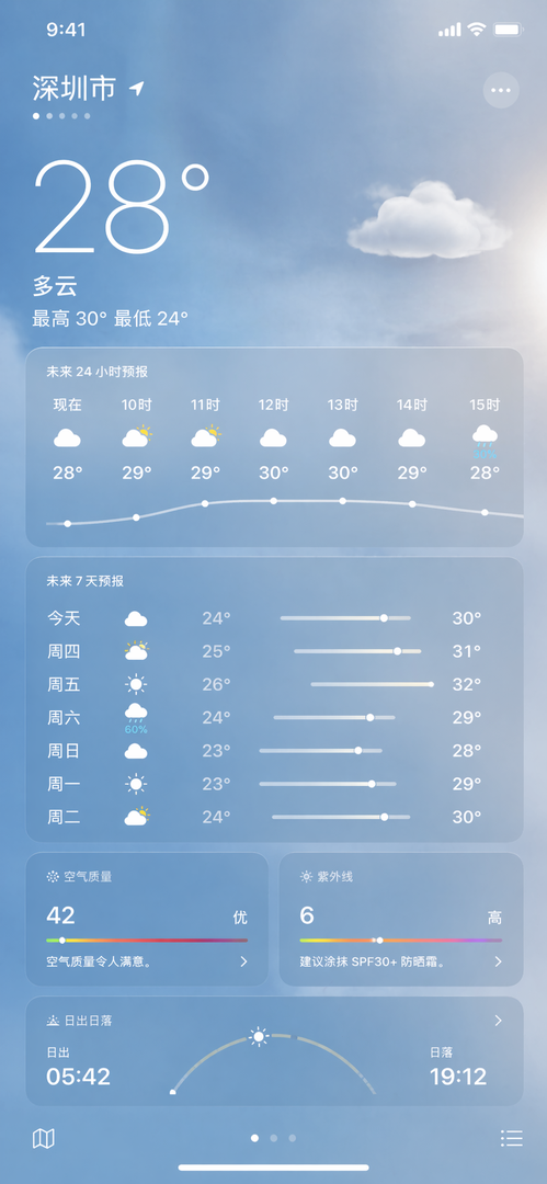 再到 UI 设计这一块,如果你跟它说要设计一款 App 的 UI 界面,它基本上都会直接匹配好现在手机整个的界面尺寸。可以看到下面这些设计并不是我们比较熟悉的既定标准尺寸,而是匹配好了手机屏幕的长度尺寸。 然后再看画面,我先让他做了一个类似于手账风格的日常记账类 App,然后又让他给我输出了一个苹果风格的天气 App 页面。
